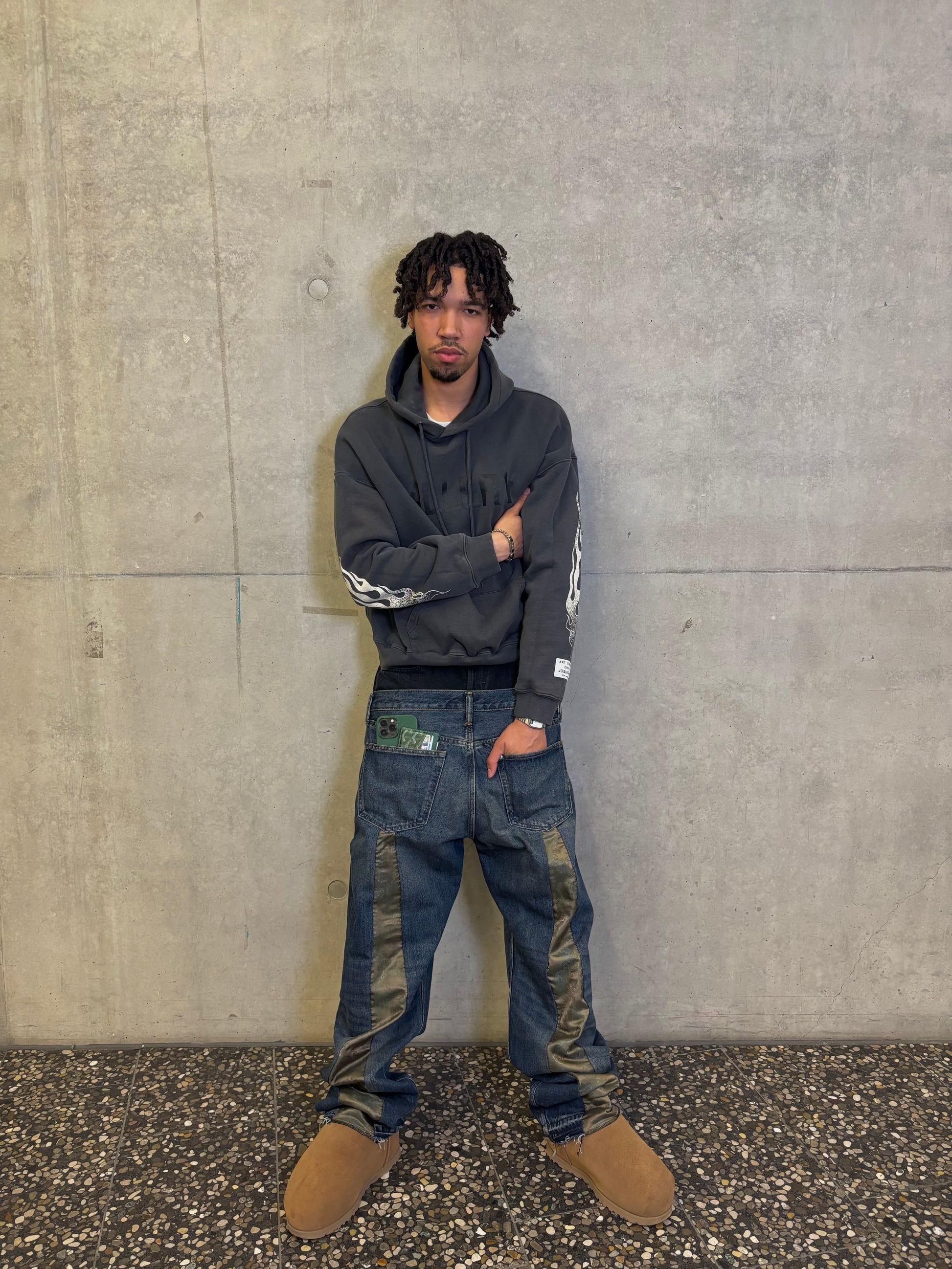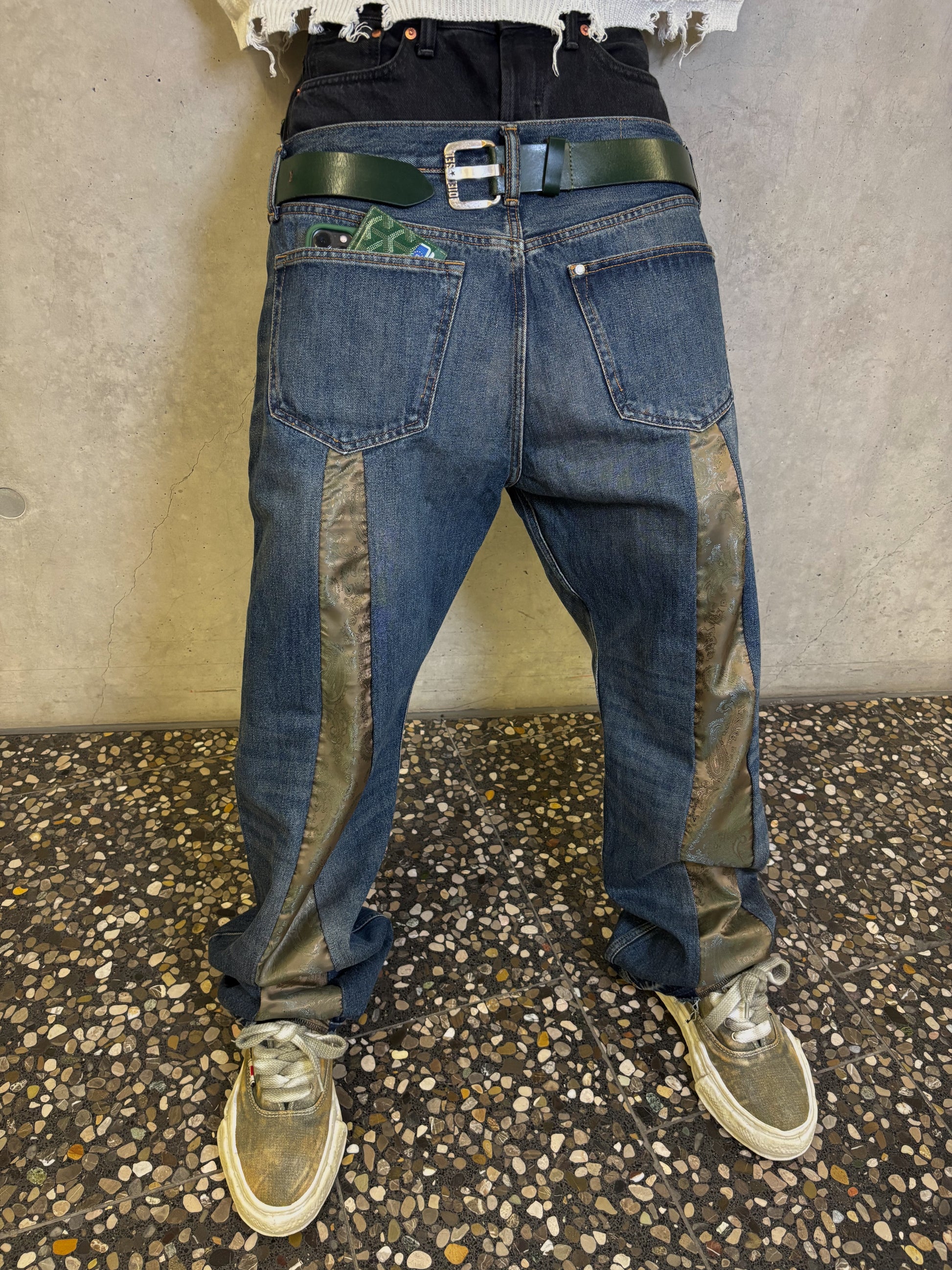 Reworked layered Denim with green Jacquard Paisley fabric on the front.